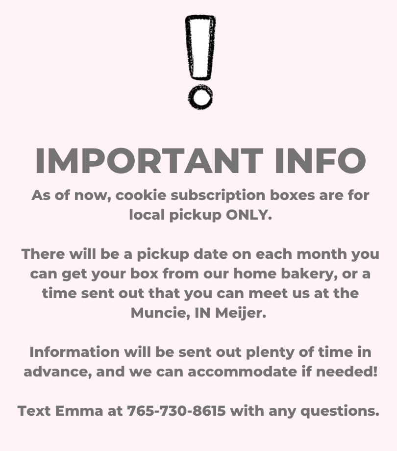 If you pay after the 15th of the PRESENT month, your consecutive 6-month subscription box will not start until the following month. For example, if you purchase the 6 month subscription on November 15th or before, you will get cookies for December, January, and February, March, April, and May. If you purchase on November 16th, you will get cookies for January, February, and March, April, May, and June.
